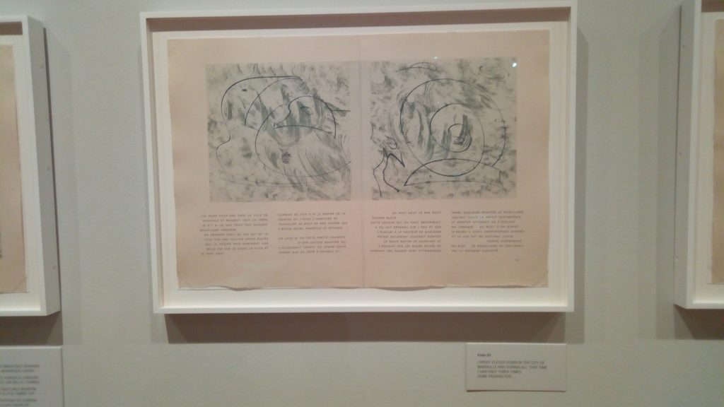Ce jour-là, une exposition était dédiée à Louise Bourgeois. Vous ne savez pas qui c’est ? Tant mieux, moi non plus. Mais j’ai découvert qu’elle sculptait. L’araignée, c’est sa propre mère… J’en retiens assez essentiellement qu’elle n’était pas habitée par la joie de vivre. D’autres artistes sont exposés, et si vous plissez bien les yeux, les photos suivantes vous montreront des papiers griffonés en français -dont un sur Marseille. Je vous le transcris ci-dessous si vous n’arrivez pas à le lire.