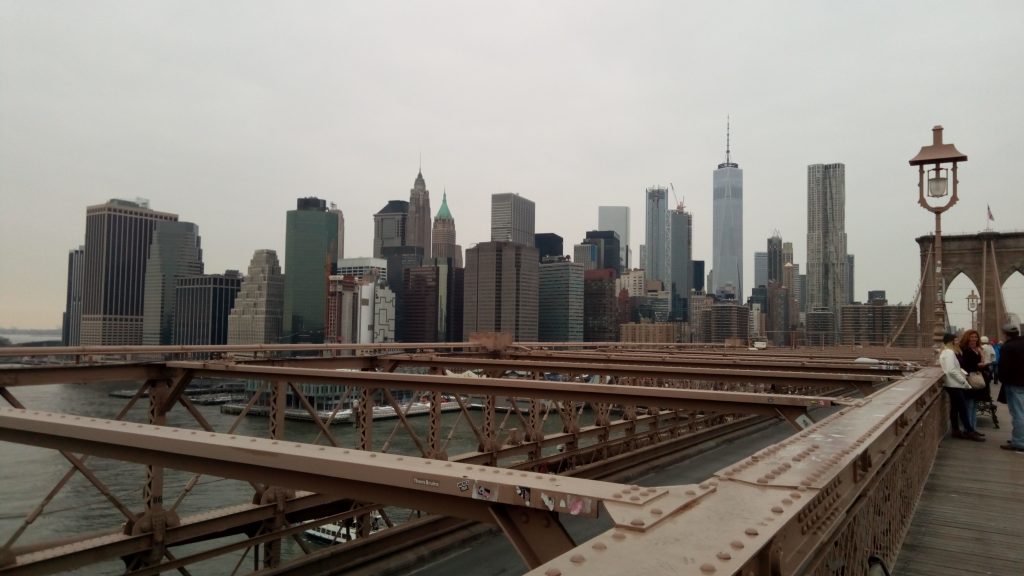 Une fois finie ma visite, je redescends au métro, et mon tour de la ville se poursuit au Brooklyn Bridge. Traversable à pied comme en voiture, ce pont est emblématique de la ville de New York car il désenclave l’île de Manhattan et est d’une architecture impressionnante. Il a par ailleurs fait l’objet de rénovations, dont la dernière est rappelée par une plaque commémorative. Il est relativement long, mais assez peu fréquenté par les touristes, au final.