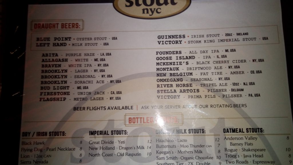 A près de sept heures, il est temps d’aller manger un dernier repas avant de retourner à l’hôtel. J’avais lu du bien d’un bistrot à bières dans Brooklyn, et m’y rends. Je me dis qu’ils ont à manger… Perdu ! Mais la bière à la banane qu’ils me servent est excellente.