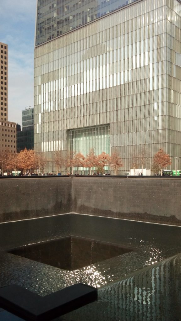 Une tour, One World Trade Center, a été construite à côté de son ancienne homologue. En hommage, je suppose, les dix premiers étages de cette nouvelle tour sont similaires à ceux de la tour d’origine, à savoir d’apparence métallique; la structure vitrée plus haut diffère largement, en revanche, donnant plus sur le bleu, reflétant le ciel, et les vitres sont probablement teintées.